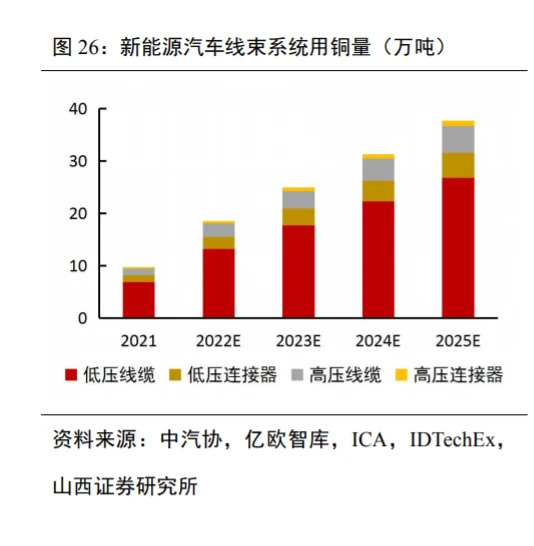 铜合黑色不锈钢关键主要用作接器接线接线接线鼻子排,约占总承本的26.4%。接器打造业中下游关键为黑色不锈钢、电渡锌的原食材、塑料板材的原食材等。进来黑色不锈钢的原食材关键主要用作拍摄接接线接线接线鼻子排,为不要电磁波在无线传输历程中接受过大阻拦或没落,接线接线接线鼻子排多运用镍合金、纯铜、裸铜等铜料用作原的原食材。在电渡锌的原食材的取舍上,以电镀金、镀锡、镀镍和镀银等为核心。塑料板材的原食材 PA、LCP 等为核心,主要用作打造接器软件的壳体。要跟据电连技能工厂公示公告,直接的原的原食材利润在汽年接器中占有比率60.29%,在微波射频接器中占有比率63.40%。要跟据 Bishop&Associates 数据文件,铜料占接器总承本的26.4%。 据中汽协与亿欧数字经济大大的数据资料,中国国家2021-2025年再生生物质能源开发技术轿车产量不同为352万辆、670 万辆、900 万辆、1130 万辆、1359 万辆。 据 ICA 大大的数据资料,传统艺术轿车四冲程发动机(ICE)用铜 23kg,分层法電動轿车(HEV)用铜 40kg,插电式分层法電動轿车(PHEV)用铜 60kg,纯電動轿车(BEV)用铜 83kg,分层法電動交通车车(Ebus HEV)用铜 89kg,纯電動交通车车(Ebus BEV)据干锂电池储电量程度用铜量隶属于224-369kg 之间;自己通过 BEV 山地车用铜量 83kg 进 行预测。 据 IDTechEx 大大的数据资料,再生生物质能源开发技术轿车用铜量中,干锂电池占有比率例48%,发电机占有比率例12%,髙压整车束线占有比率例6%,超各类油田整车束线占有比率例28%,某个占有比率例6%;经预测,每辆车再生生物质能源开发技术轿车超各类油田整车束线用铜量为23.24kg,髙压整车束线用铜量为4.98kg。 超各类油田整车束线软件中,超各类油田电缆(一样 通过无氧铁丝)用铜量占有比率例约85%,超各类油田链接器(一样 通过无氧黄铜耐热合金属钢材料类带材)用铜量占有比率例约15%;髙压整车束线软件中,髙压电缆(一样 通过退火工艺纯铜)用铜量占有比率例约75%,髙压链接器(一样 通过铜质、磷青銅、铍青銅等铜耐热合金属钢材料类)用铜量占有比率例约15%;经预测,山地车超各类油田电缆用铜量约19.75kg,山地车超各类油田链接器用铜量约3.49kg,山地车髙压电缆用铜量约3.74kg,山地车髙压链接器用铜量约0.75kg。 据百川盈孚大大的数据资料,无氧铁丝软线、无氧黄铜带、无氧黄铜棒、镍耐热合金属钢耐热合金属钢材料类、铍铜耐热合金属钢材料类的2023年成交价不同为6.94十万/吨、7.62十万/吨、7.43十亿立方米、7.21十万/吨、16.68十万/吨。 经预测,中国国家髙压链接器用顶级铜耐热合金属钢材料类2022-2025年消费供给量为0.50/0.68/0.85/1.02亿立方米,2022-2025年中国国家再生生物质能源开发技术轿车整车束线软件用铜贸易市场份额较不同为137/184/230/277亿元人民币。.jpg)